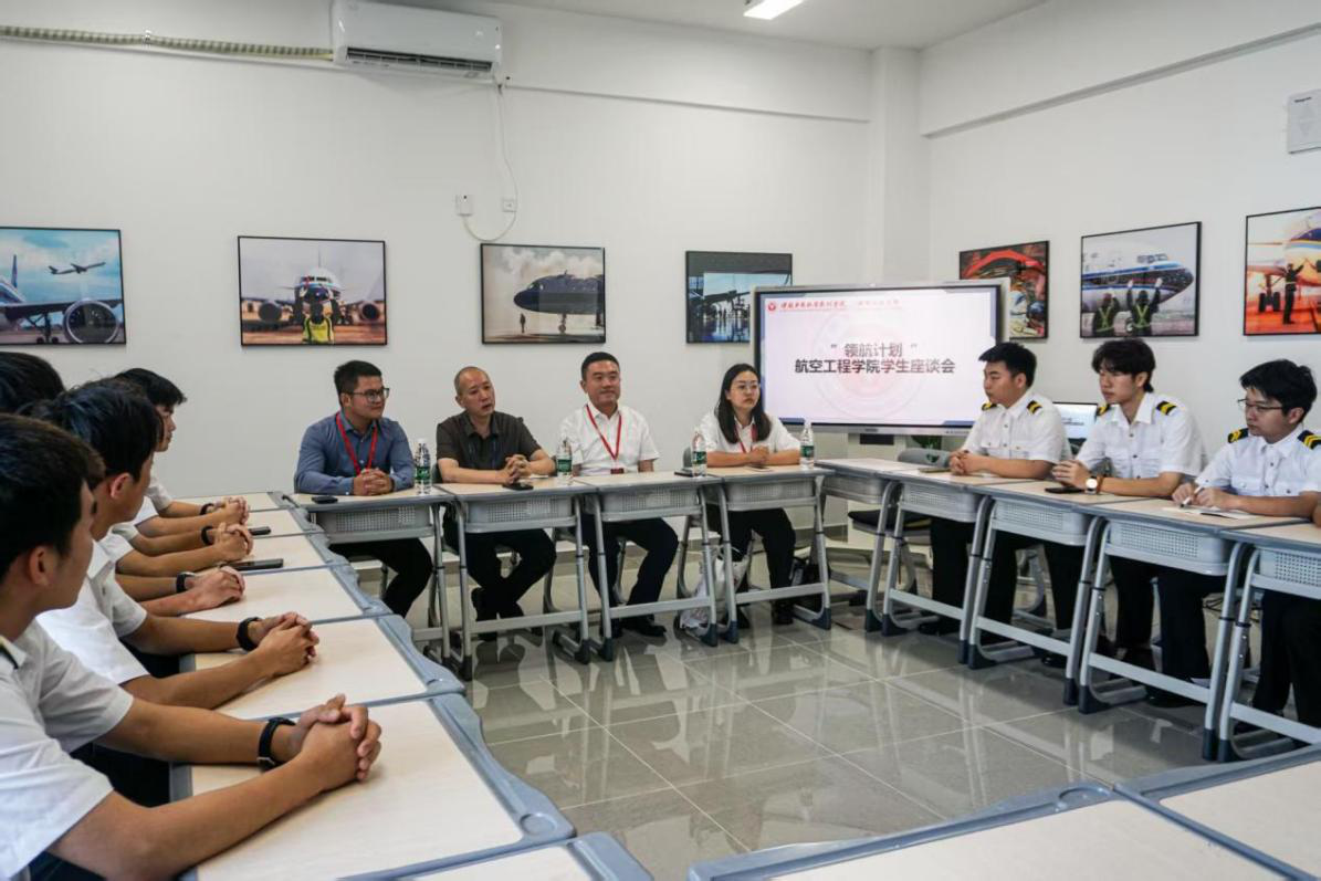座谈会上,吴斌首先对两位校友的到来表示热烈欢迎,并简要介绍了“领航计划”的初衷与目标,强调职业规划对于学生成长成才的重要性。随后,赵闯和何磊两位校友结合自身经历,分享了从校园到职场的转变过程,包括如何面对挑战、把握机遇,以及在航空领域内不断学习与成长的经验。他们鼓励在场同学要明确目标,积极规划大学生活,充分利用学院提供的优质资源,不断提升自己的专业技能和综合素质,为将来的职业生涯打下坚实的基础。互动环节中,同学们踊跃提问,涉及职业选择、技能提升、行业发展趋势等多个方面,两位校友耐心解答,现场气氛热烈而融洽。